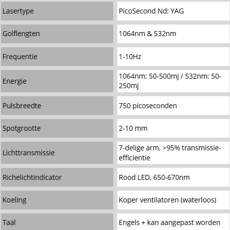 Veel toepassingen: Tatoeageverwijderen, pigment- ouderdomsvlekken, huidverjonging en textuurverbetering.